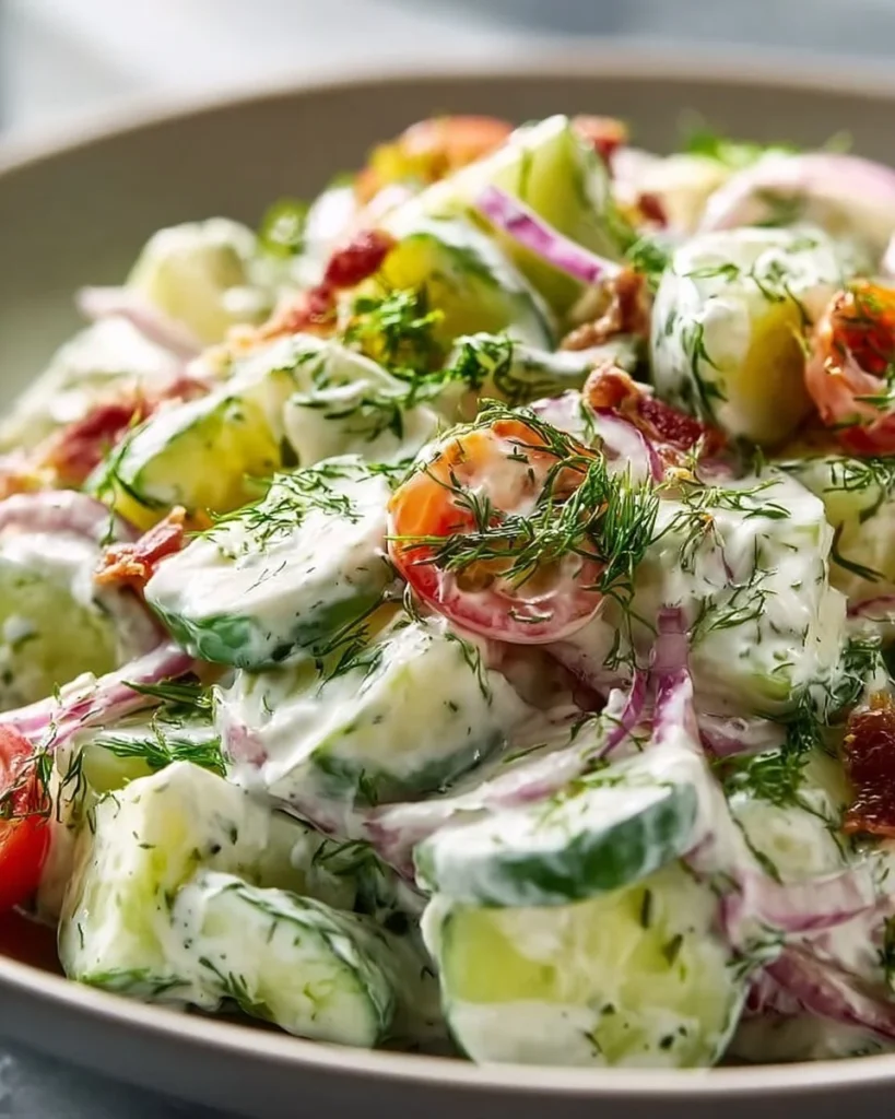 Serving this salad is all about showcasing that vibrant, colorful mix! Picture this: a large, beautiful bowl filled with crunchy green cucumbers, bright red tomatoes, and golden crispy bacon. Drizzle a bit of extra ranch on top for an eye-catching presentation. You can serve it as a side for grilled meats, or enjoy it as a refreshing lunch on a hot day. The aroma of fresh herbs mixed with rich dressing is just beyond. Your guests will be lining up for a taste!
